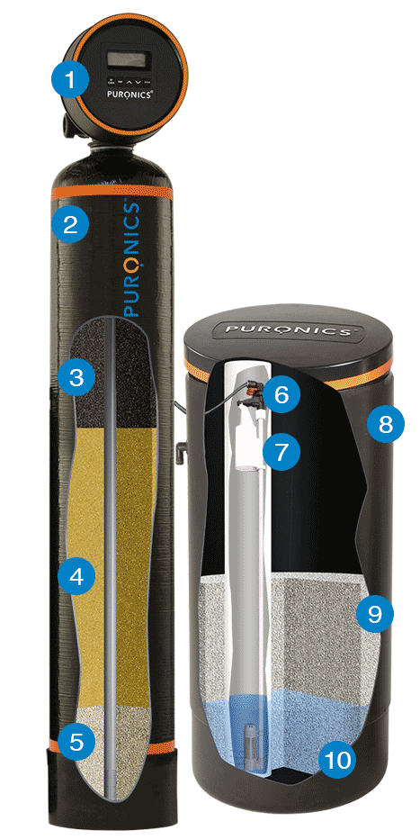The Puronics® Defender™ iGen® C (with ChloroShield™ Clearess® media) utilizes our proprietary Chlorostatic® Technology to reduce the levels of chloramine, chlorine, and hardness typically found in municipal water supplies. Chloramine is a common municipal water disinfectant, but is corrosive to lead and copper water lines and could have possible side effects for people and fish. This whole-house water softener and filtration system combines the advanced technology of the intelligent iGen® control valve and a durable fiberglass media tank to provide superior quality, healthy water for years to come.